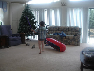 The Pantless Jedi defeating the evil Socker Bopper Power Ranger! He's sporting two light sabers--- watch out world!
